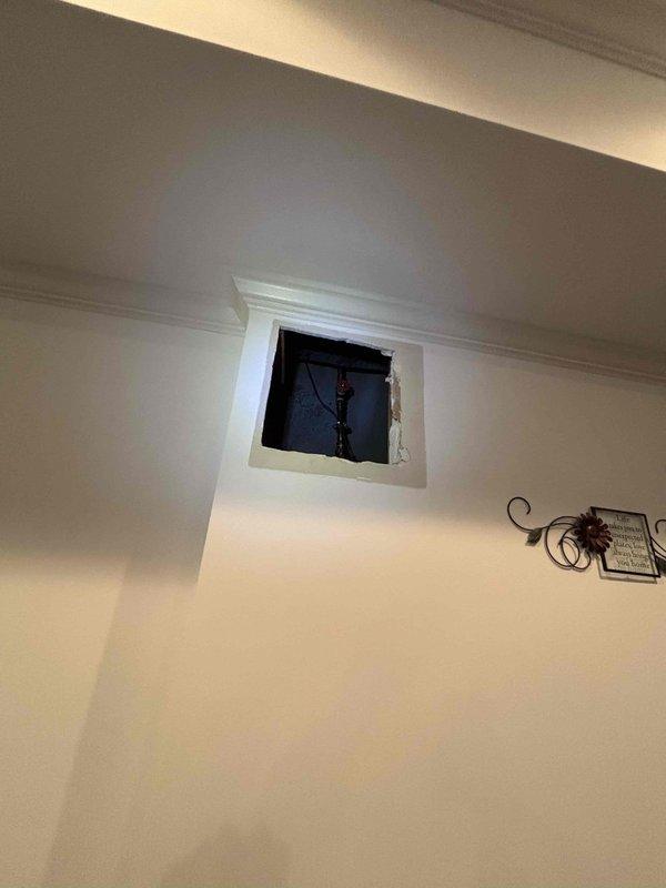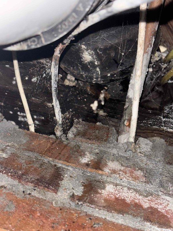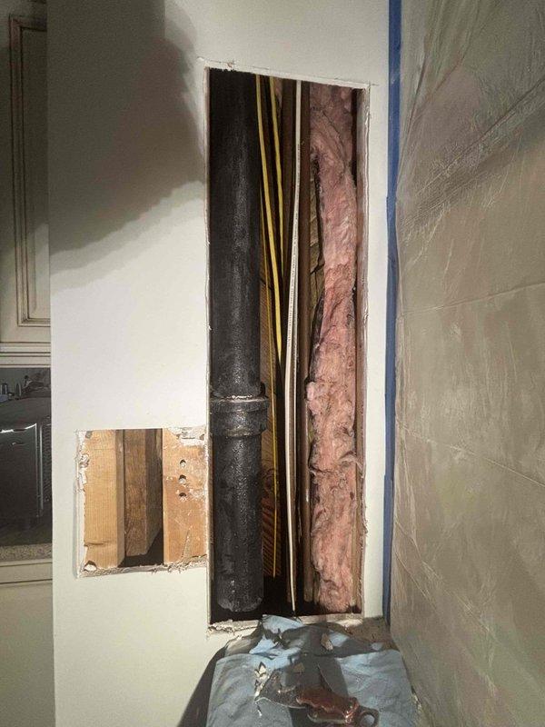 Atlanta, GA - Accessed wall cavity to inspect plumbing and electrical systems. Removed drywall to expose a vertical black drain/vent pipe, electrical wiring, and insulation. Documented significant dust accumulation, possible mold, and corrosion on metal components in the confined space behind fixtures. Atlanta, GA - Accessed wall cavity to inspect plumbing and electrical systems. Removed drywall to expose a vertical black drain/vent pipe, electrical wiring, and insulation. Documented significant dust accumulation, possible mold, and corrosion on metal components in the confined space behind fixtures.