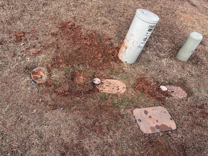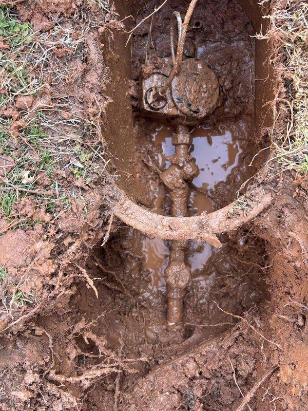 Suwanee, GA - Responded to customer's report of a water leak near meter in front yard. Excavated area around suspected leak, revealing a compromised sprinkler system connection with significant soil saturation. Located and exposed the main shut-off valve which was heavily encrusted with mud, indicating ongoing leakage issue. Suwanee, GA - Responded to customer's report of a water leak near meter in front yard. Excavated area around suspected leak, revealing a compromised sprinkler system connection with significant soil saturation. Located and exposed the main shut-off valve which was heavily encrusted with mud, indicating ongoing leakage issue.