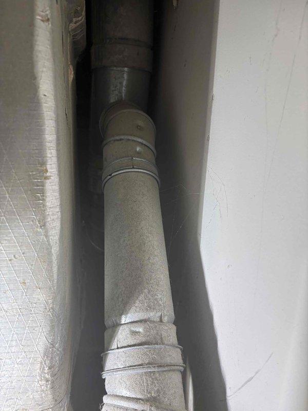 Identified and repaired ceiling leak caused by corroded pipe fitting in living room. Removed damaged section, installed new PVC pipe with proper 90-degree bend and secure metal clamps, ensuring proper connection to existing plumbing system. Confirmed repair by testing water flow with no further leakage observed.