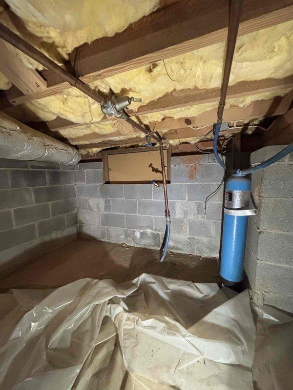 Conducted a site assessment for a reported water leak in the main line between the meter and house. Inspected the basement/utility area which contains a water heater system with copper piping and a blue cylindrical tank (possibly filtration or pressure). Observed evidence of excavation in the dirt floor area, suggesting previous attempts to address the leak issue or related plumbing work.