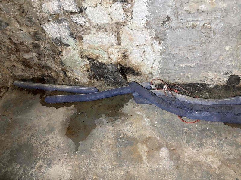 Inspected basement with significant water infiltration through aging stone/concrete walls showing visible staining and mold growth. Installed water barrier system along affected wall areas and extended exposed sewer line to proper drainage point to prevent future leakage. Redirected existing plumbing (blue insulated pipes) to ensure proper water flow away from the foundation.