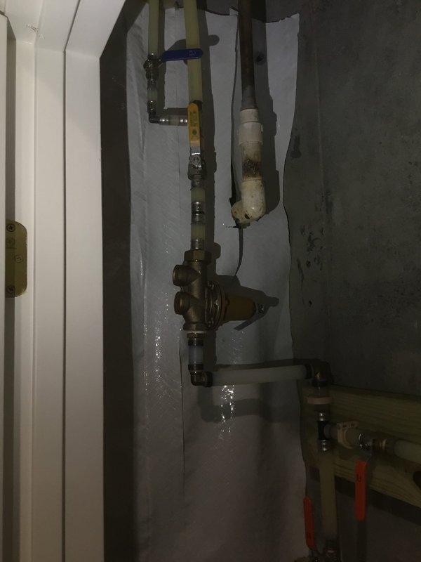 Completed PRV replacement as per approved quote. Installed new pressure regulating valve in the plumbing system, connecting it to the existing blue PVC supply lines. Verified proper function with pressure gauge showing appropriate PSI readings within operational parameters.