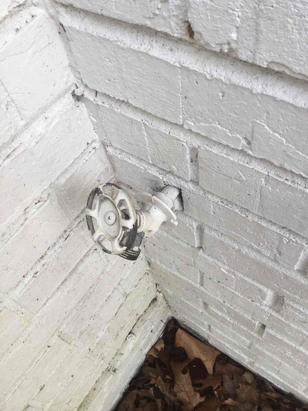 Peachtree Corners, GA - Performed inspection and replacement of upstairs toilet as per approved quote. Documented existing water supply fixture condition with photographs showing aging hose bib installed in painted brick wall corner with visible wear on metal components and surrounding wall surface. Peachtree Corners, GA - Performed inspection and replacement of upstairs toilet as per approved quote. Documented existing water supply fixture condition with photographs showing aging hose bib installed in painted brick wall corner with visible wear on metal components and surrounding wall surface.
