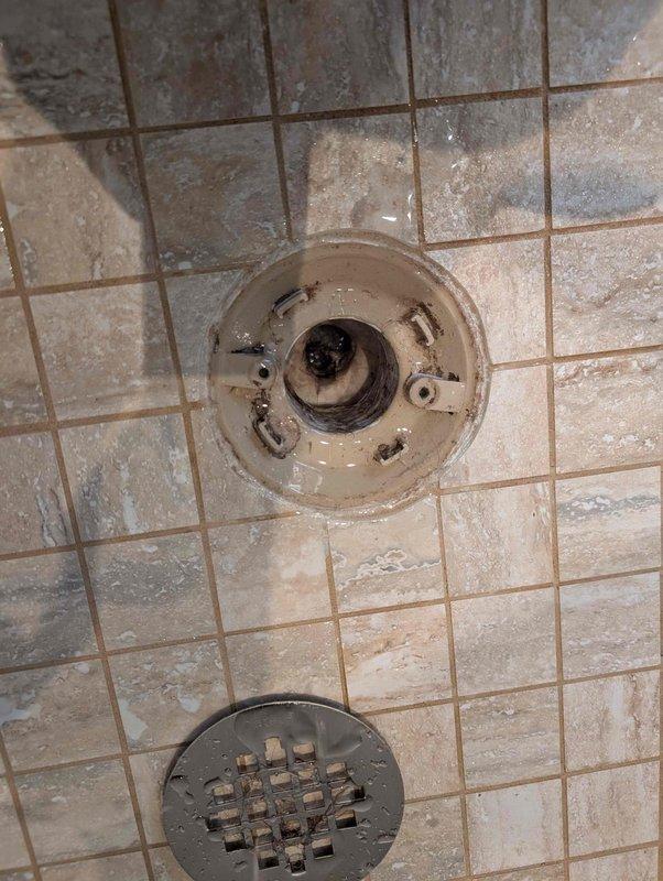 Responded to service call for bathroom plumbing issues. Successfully snaked shower drain to restore proper drainage function. Retrieved sink stopper screw top that had fallen down drain. Documented condition of drain fixtures and surrounding tile for service records.