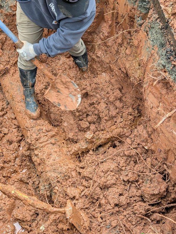 Vinings, GA - Excavated area to locate source of water leak as per approved quote. Located and exposed damaged pipe embedded in saturated clay soil. Dig team confirmed the leak's location and provided access for necessary repair work. Vinings, GA - Excavated area to locate source of water leak as per approved quote. Located and exposed damaged pipe embedded in saturated clay soil. Dig team confirmed the leak's location and provided access for necessary repair work.