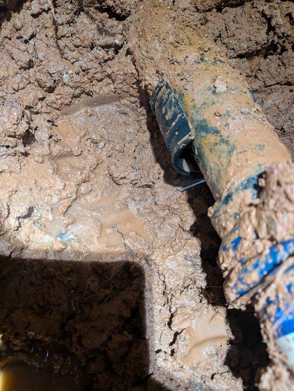 Excavated area to locate source of water leak as per approved quote. Located and exposed damaged pipe embedded in saturated clay soil. Dig team confirmed the leak's location and provided access for necessary repair work.