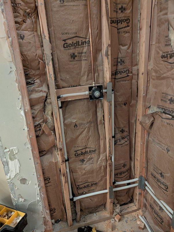East Cobb, GA - Completed rough-in plumbing installation for freestanding tub according to approved quote specifications. Installation included running horizontal supply lines through wall framing and mounting necessary valve/control unit to wooden studs. Documented installation with photos prior to drywall completion.