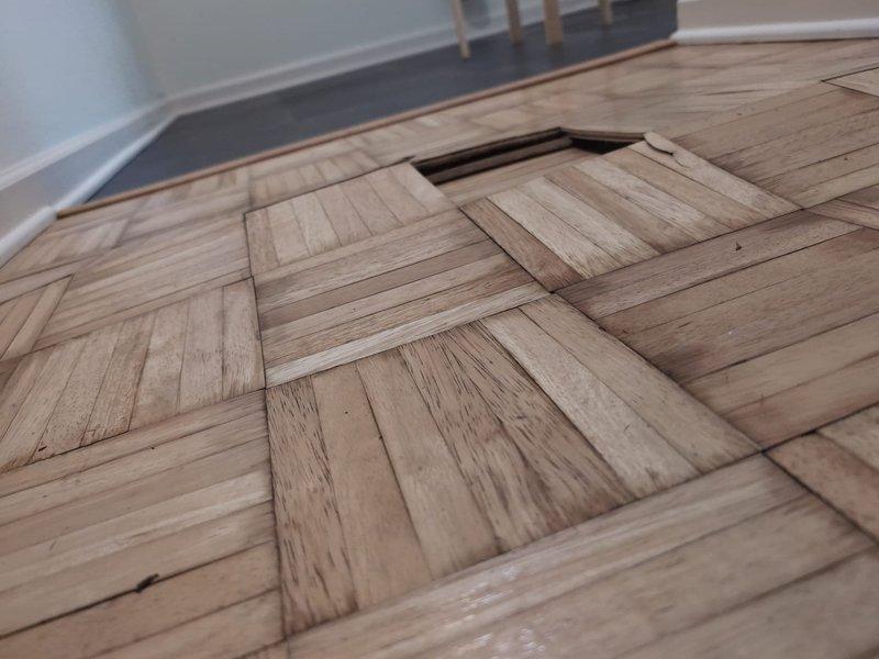 Responded to service call for clogged drains in basement following recent septic tank pumping. Inspection revealed kitchen sink drainage issues with visible residue accumulation and a more severe problem in the basement where water damage had caused significant deterioration of the parquet flooring, creating a collapsed section. Successfully cleared the blockage and advised customer on necessary flooring repairs.