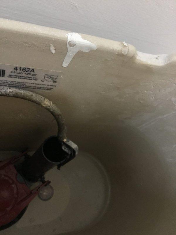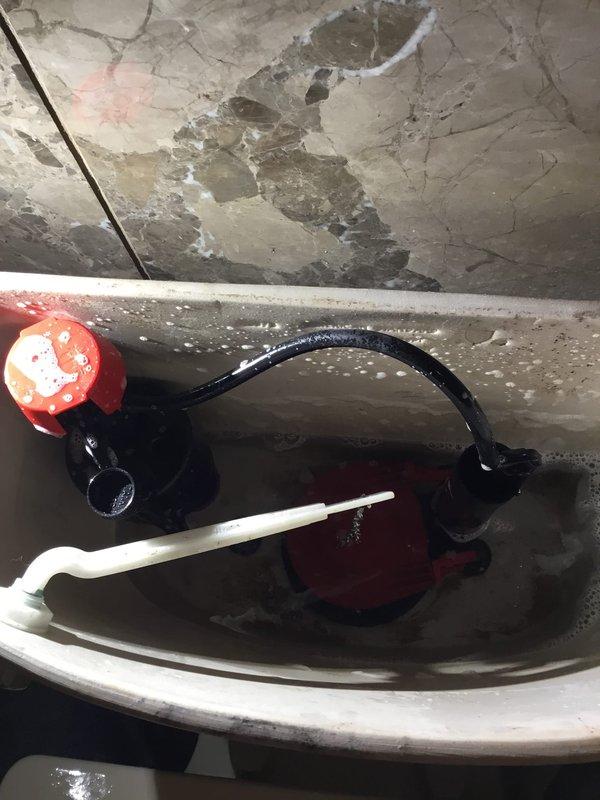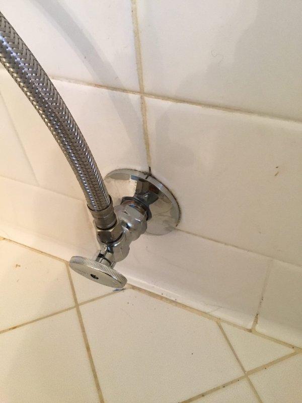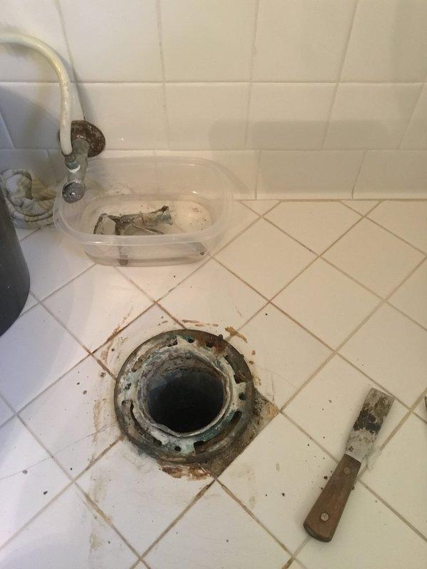 # Job Description Responded to service call for malfunctioning toilet flange and defective shut-off valve. Upon inspection, found toilet flange severely corroded with significant rust deterioration and debris accumulation, rendering it unable to properly seal the toilet to the drain pipe. The flange showed extensive wear with compromised structural integrity around the mounting area. Assessed the water supply shut-off valve serving the toilet and confirmed it would not fully close, preventing complete water isolation to the fixture. The valve assembly featured a chrome-plated body with braided metal supply line connection. Testing revealed internal component failure preventing full valve closure, creating a potential for water damage and making future toilet service impossible without main water shut-off. Documented existing conditions through photography showing the deteriorated flange with brown corrosion staining on surrounding floor tiles and the wall-mounted shut-off valve inst