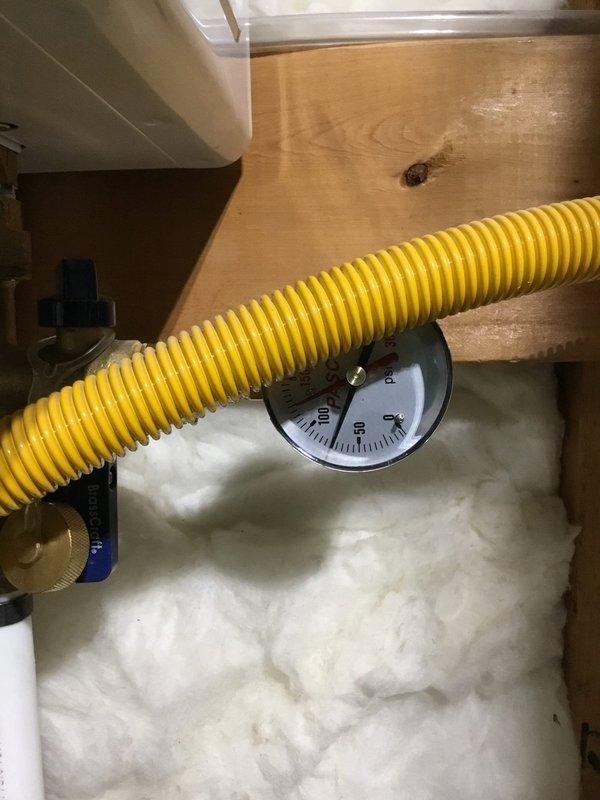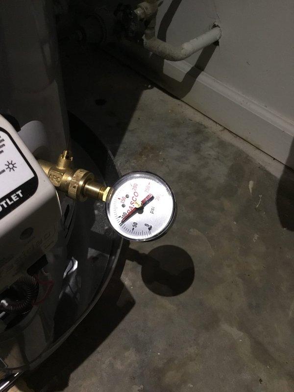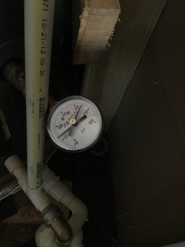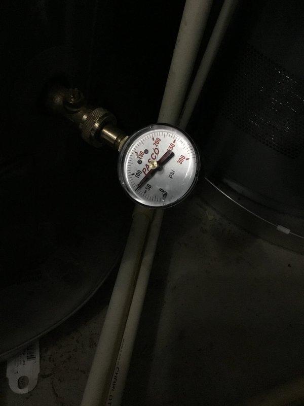 Responded to service call for leaking faucet in mechanical utility space. Upon inspection, verified pressure readings on system gauge connected to insulated piping via brass fitting to ensure proper water pressure levels were maintained. Addressed leak issue and confirmed system integrity with all connections secure and functioning properly.