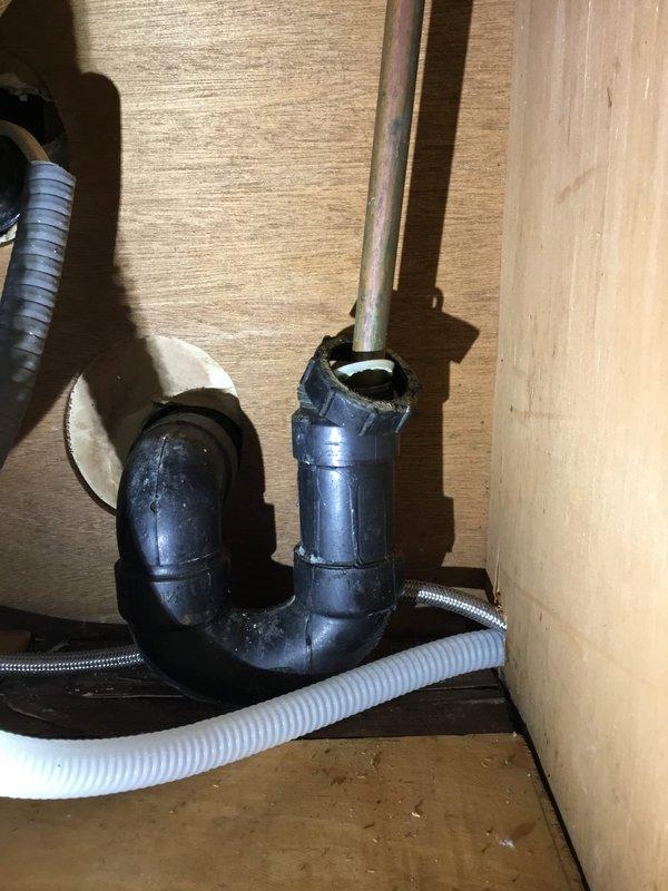 Replaced damaged dishwasher drain line with new PVC P-trap assembly and installed copper vertical drain pipe to prepare for new dishwasher installation. Serviced two toilets by replacing worn internal components to restore proper function and prevent leaking.