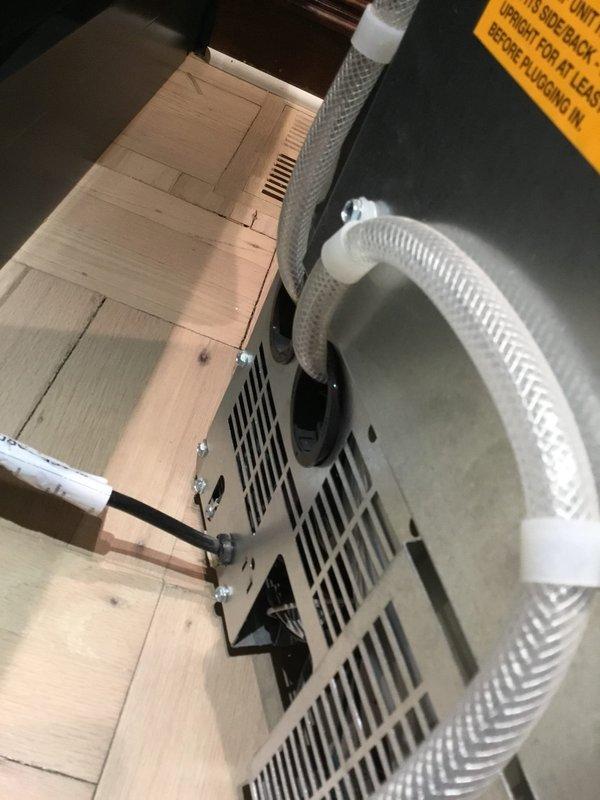 Conducted follow-up inspection regarding customer report of icemaker error code after our previous drain installation. Examined the installation site and documented the current configuration with photos, showing the HVAC component with connected white braided condensation lines properly installed on wooden flooring. Determined the issue appears to be related to communication between the drain installation and the icemaker system rather than our plumbing work.