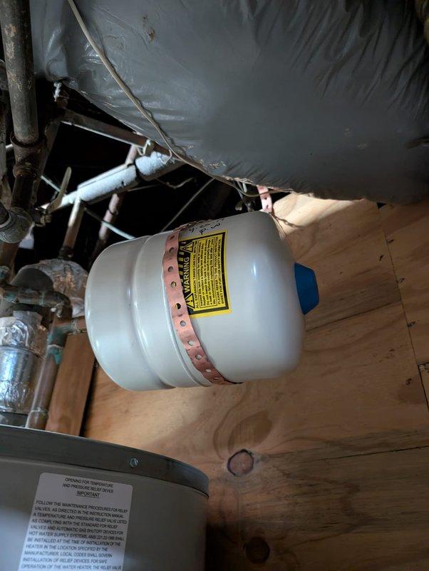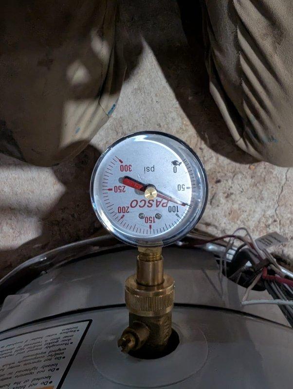 Responded to service call for a leak in crawlspace pipe. Inspection revealed excessive pressure (approximately 100 PSI) on the system gauge, which was causing the leak. Installed a new expansion tank with proper strapping to regulate pressure and replaced the damaged pipe section, successfully resolving the leak issue.
