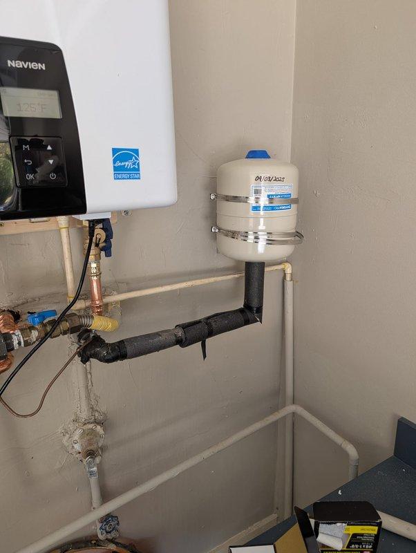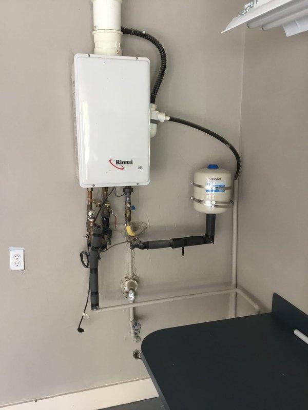 Successfully installed a Rinnai tankless water heater system with proper venting and an expansion tank. System includes all necessary plumbing connections with copper pipes, brass fittings, and insulated lines. Unit was tested and confirmed operational with temperature set to 125°F per manufacturer specifications.