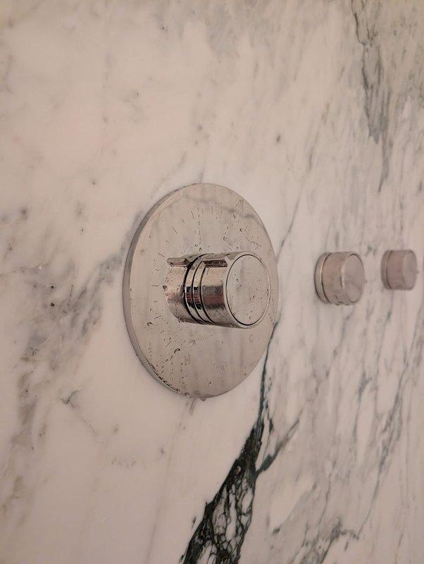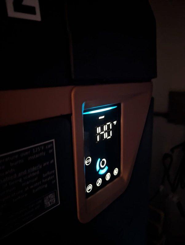 Responded to water heater service call. Diagnosed issue with digital temperature control panel showing 10°F reading and illuminated blue function indicators. Inspected bathroom fixture controls and found mineral deposits on the chrome valve handles that were affecting proper operation. Descaled components and recalibrated temperature settings to restore normal functionality.