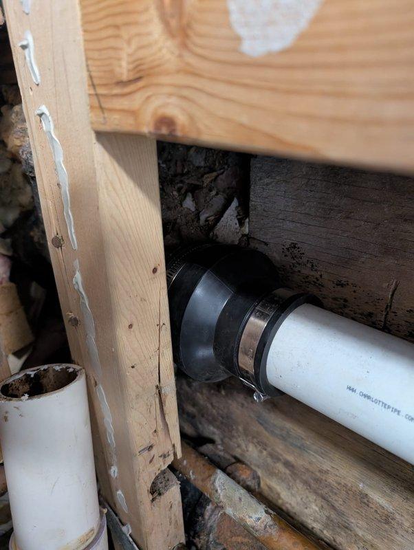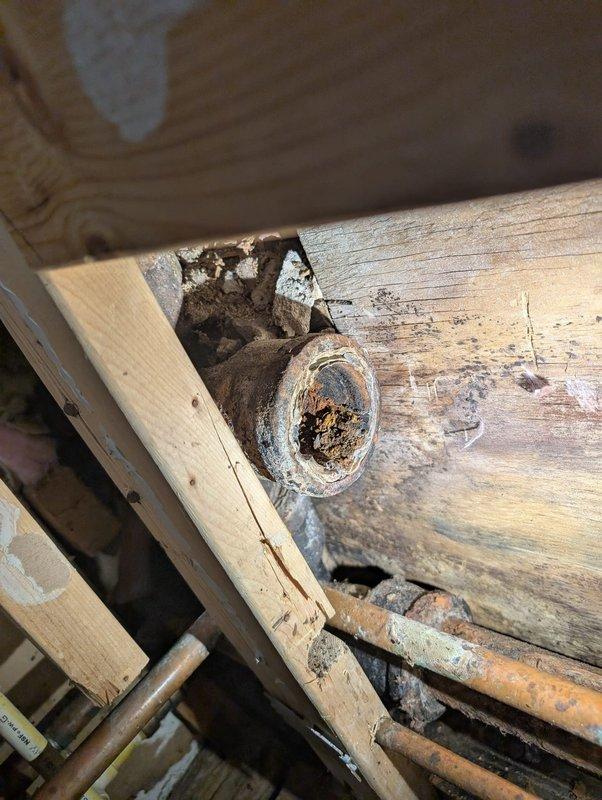 Responded to water leak investigation where remediation team had opened walls for access. Located source of leak in crawl space area affecting wooden structural members and plumbing system. Documented deteriorated beam with compromised knot hole and water damage, along with copper piping showing oxidation beneath floor joists. Identified drainage system with white PVC piping and black rubber coupling requiring attention due to moisture intrusion affecting both new and aged wooden framing members.