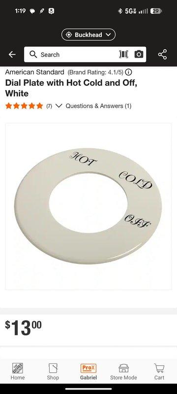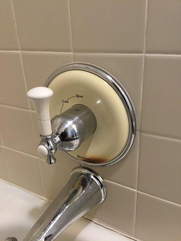 Assessed upstairs bathroom plumbing fixtures requiring completion and repair from previous work. Documented existing bathtub faucet assembly with chrome-plated spout and temperature control dial featuring cross-handle valve. Identified replacement dial plate specifications for American Standard fixture. Discussed scope of work including gas line capping at stove location, pot filler relocation, and bathroom finishing requirements to address burn damage from prior installation.