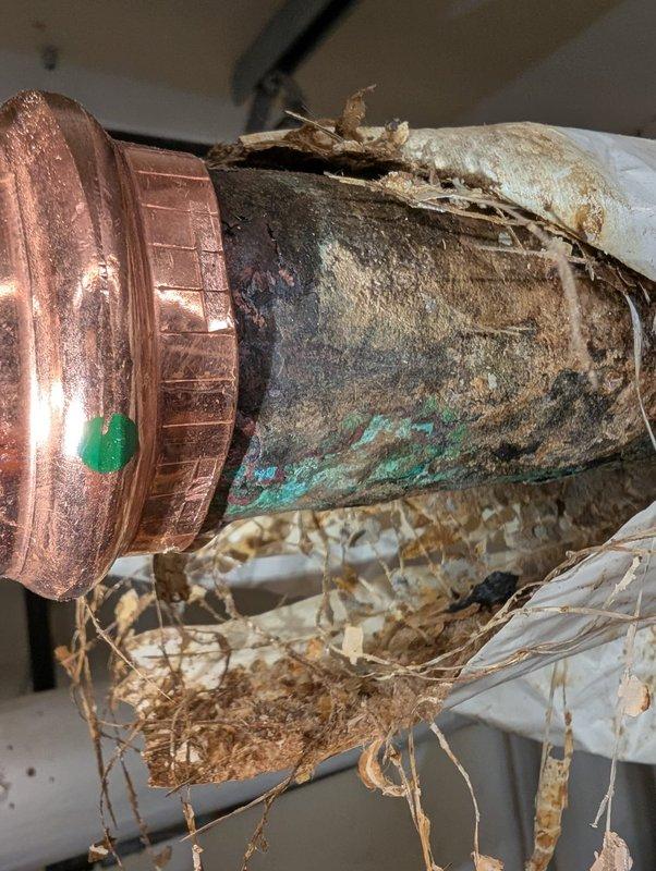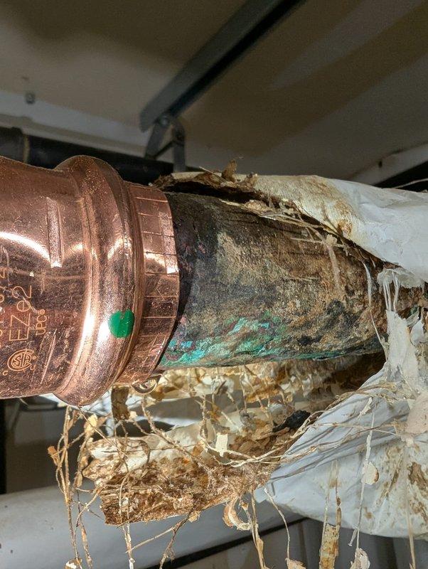 Completed copper pipe repair beneath cabinet fixture. Addressed severely corroded copper piping that exhibited extensive green patina, verdigris, and heavy oxidation from prolonged moisture exposure. Removed deteriorated white insulation material that had become heavily water-damaged, discolored, and compromised around the pipe connections. Replaced corroded copper fittings and sections showing advanced corrosion with pitted surfaces and multiple oxidation patterns. Installed new copper components and properly insulated repaired sections to prevent future moisture intrusion and corrosion.