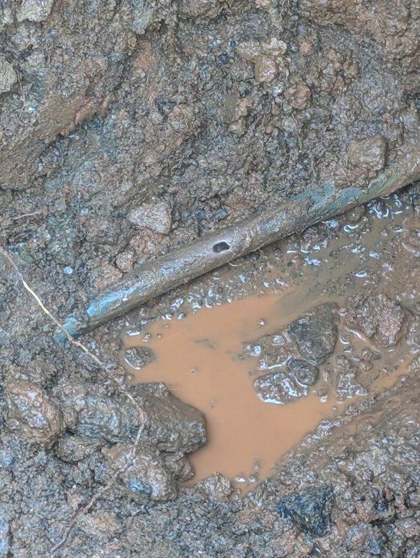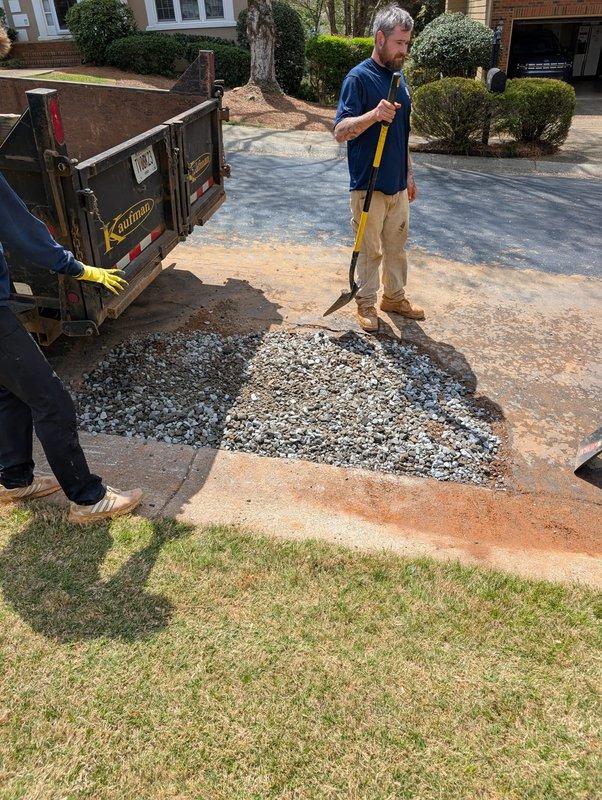 Performed exploratory excavation to locate and expose underground utility infrastructure per approved scope of work. Excavated compacted soil and removed material to access buried piping system running through the work area. Encountered water accumulation in excavation zone with turbid conditions indicating potential drainage or leak issues. Exposed metallic conduit or pipe partially embedded in substrate for inspection and assessment. Backfilled excavation area with crushed stone aggregate material and performed grading and leveling operations on driveway surface to restore site conditions. Completed material placement and surface preparation to ensure proper compaction and drainage.