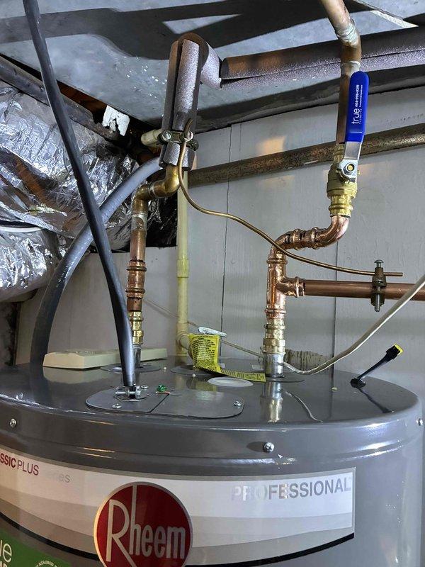 Successfully completed water heater replacement with installation of new Rheem Professional model. Performed all necessary plumbing connections, including installation of copper pipes, brass valves and fittings. System was properly connected and verified to be in full working condition.