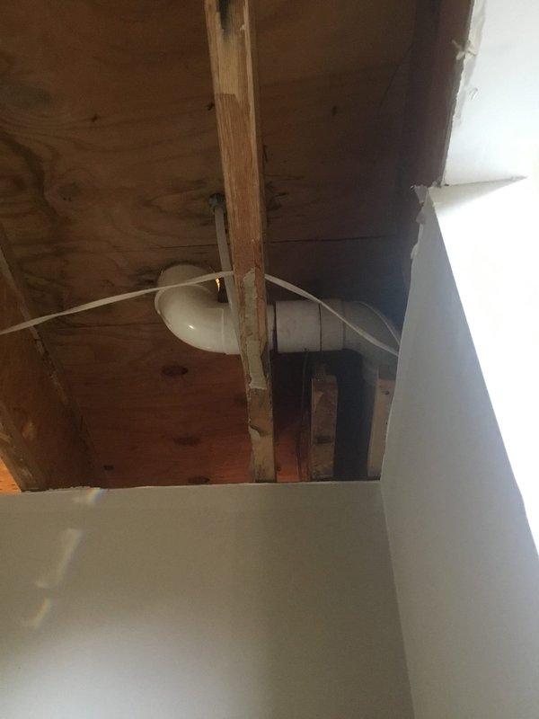 Completed waterline and drain replacement as per approved quote. Accessed plumbing system through ceiling, requiring removal of drywall to expose wooden joists and structural elements. Successfully installed new PVC drain pipes and waterlines, securing them properly to the ceiling structure.