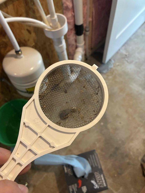 Performed scheduled tankless water heater flush service for James. Cleaned sediment from system filter as evidenced by debris accumulation on mesh screen. Inspected plumbing installation and investigated reported shower pressure issue, which appears related to previous main line work. No current leaks observed in visible piping network.