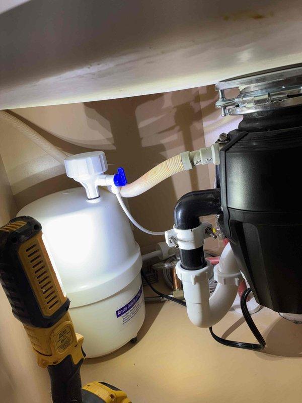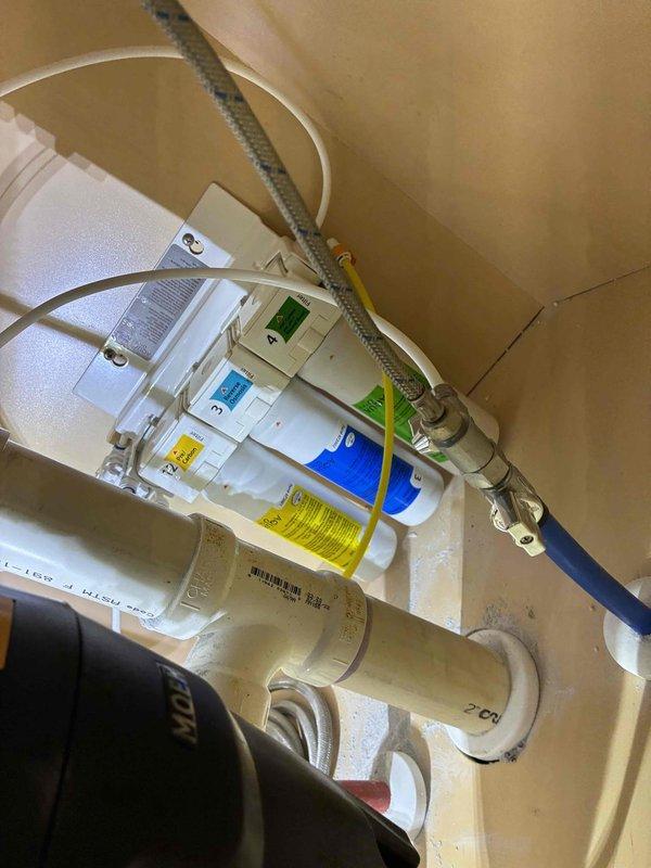 Smyrna, GA - Successfully installed customer-supplied under-sink water filtration system with four sequential filter cartridges (color-coded green, blue, yellow, and white). Connected system to existing plumbing using PVC piping and flexible hoses, ensuring proper integration with sink drain assembly and P-trap configuration. Smyrna, GA - Successfully installed customer-supplied under-sink water filtration system with four sequential filter cartridges (color-coded green, blue, yellow, and white). Connected system to existing plumbing using PVC piping and flexible hoses, ensuring proper integration with sink drain assembly and P-trap configuration.