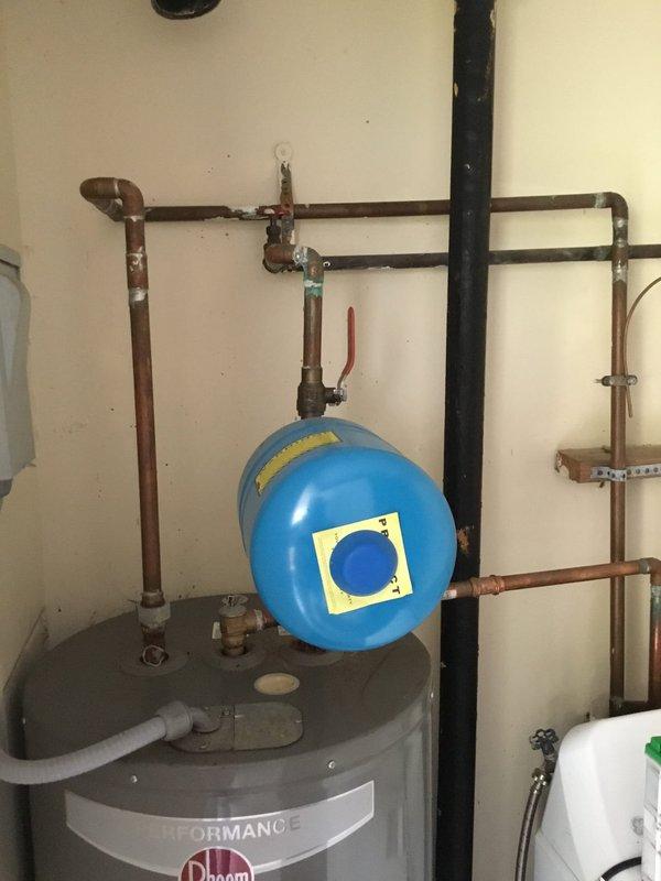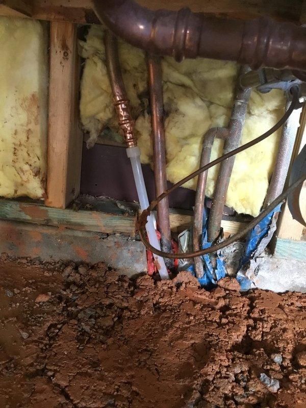Completed spot repair on plumbing system, including soldering a new copper pipe connection in the crawlspace area where exposed plumbing and insulation were present. Serviced Rheem water heater installed on wooden platform with proper venting and expansion tank connections.