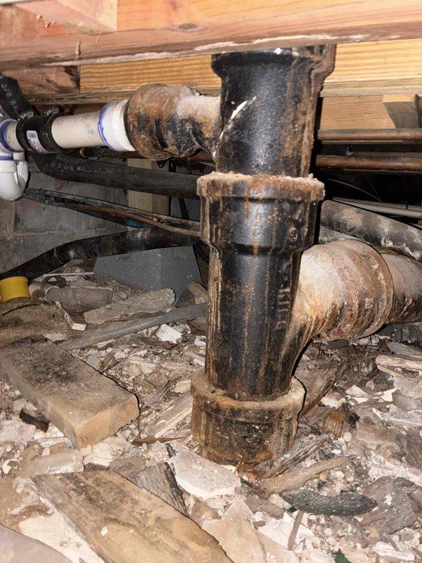 Inspected severely deteriorated cast iron sewer pipe in crawlspace that shows significant corrosion, surface rust, and structural instability where it connects to foundation. Photos documented the compromised drain line with partial PVC transition and surrounding construction debris, confirming foundation contractor's concern about insufficient support for the plumbing infrastructure.