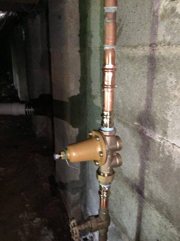 Performed complimentary sewer scope inspection and evaluated plumbing system conditions. Assessed water heater requiring replacement due to age and condition, tested water pressure using calibrated gauge, and documented existing infrastructure including corroded copper piping with brass valve assembly and structural deterioration in utility area foundation corners.