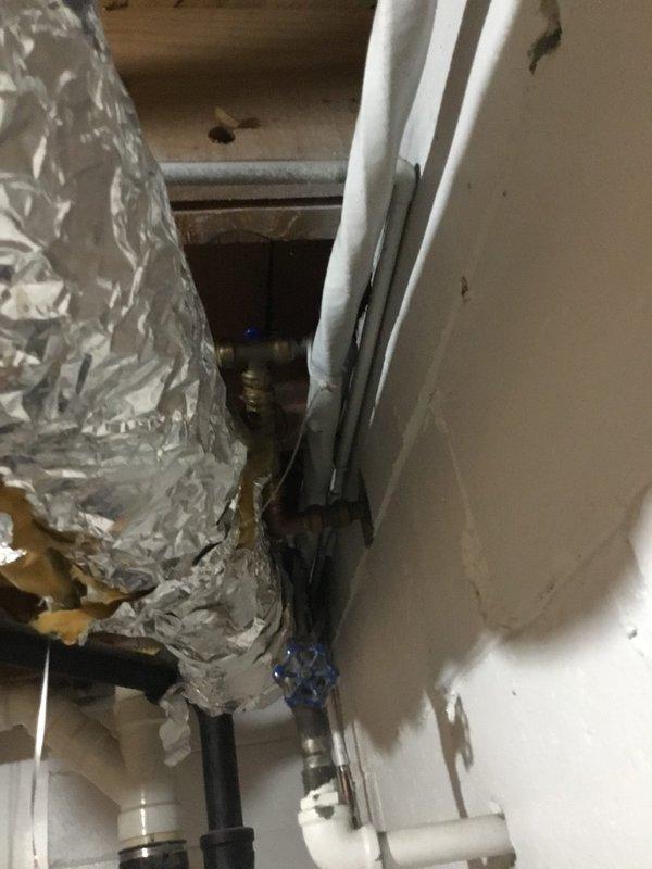 Located and repaired freeze break in copper pipe at exterior corner junction where white wall meets brick wall. Moisture damage had caused significant mold growth on white wall surface. Replaced damaged section of pipe and verified system integrity after repair.