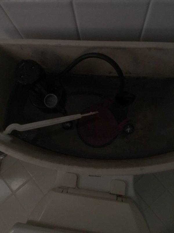 Conducted follow-up inspection on previously unserviced toilet reported as not functioning properly. Visual examination of tank interior revealed standard flush mechanism with flapper valve, fill tube, and float assembly in normal operating position. Water supply line and shutoff valve appear properly connected with no visible leaks. Documentation photos taken of tank interior components and external toilet installation.
