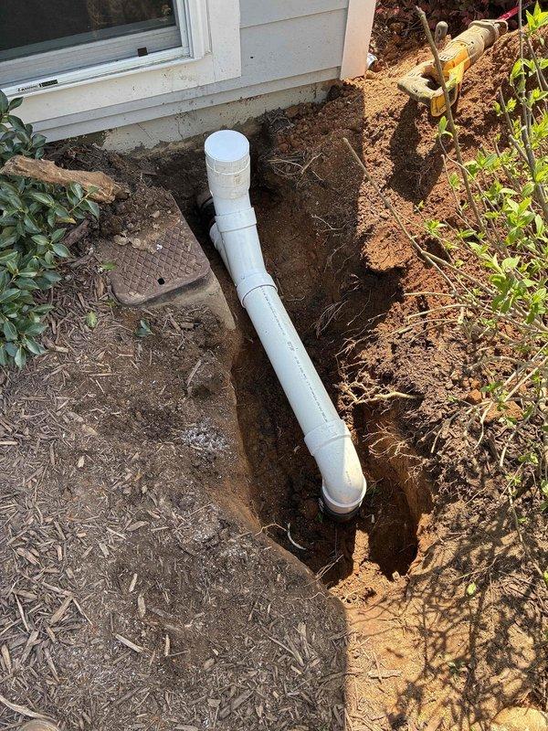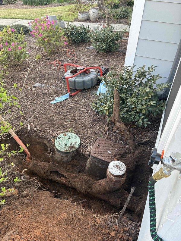 # Service Report: Sewer Line Stoppage Clearance Responded to a sewer line stoppage at a residential property. Upon arrival, excavated a trench approximately 2-3 feet deep along the exterior foundation to expose the underground drainage system. Located the affected white PVC sewer line running from the structure to the main connection point. Utilized drain cleaning equipment with motorized auger to access and clear the blockage through exposed cleanout access points in the line. Identified two access caps in the system - one weathered green cover and one white circular cap - which provided entry points for cable insertion and inspection of the line condition. Successfully cleared the stoppage and restored proper flow through the sewer line. Verified system functionality through multiple access points. Excavation revealed the pipe configuration and allowed for thorough assessment of the drainage infrastructure condition. All exposed piping appeared structurally sound with proper conne