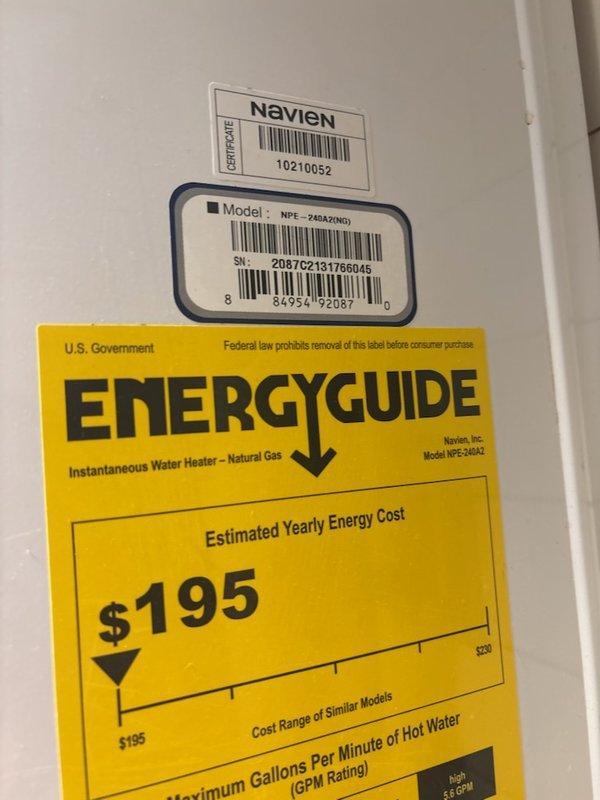 # Water Heater Service Report Responded to service call for water heater leaking at base. Upon inspection, found Navien NPE-240A2(ND) tankless natural gas water heater with visible rust staining and corrosion on mounting surface and horizontal pipe connections beneath unit. Documented existing conditions showing brown discoloration on white plumbing components and mounting bracket area, indicating previous or ongoing moisture exposure. Photographed unit identification labels, serial number 2087C2131766045, and current installation configuration including yellow flexible gas line, PVC venting, electrical connections, and digital control panel. Unit specifications confirmed as instantaneous natural gas water heater with 5.6 GPM maximum flow capacity. Captured evidence of rust patterns on mounting hardware and pipe connections for assessment and repair recommendations.