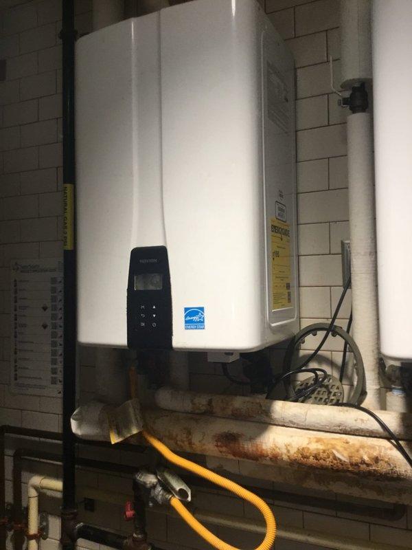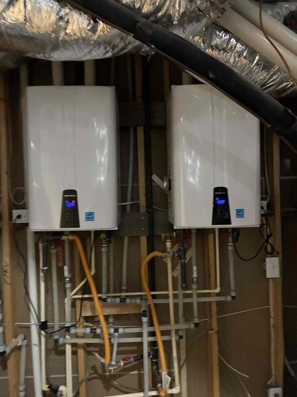 Performed maintenance and inspection on dual tankless water heater system. Verified operation of check valve components to ensure proper water flow direction and prevent backflow issues. Inspected electrical connections, wiring harnesses, and gas line installations on both units. Confirmed digital display panels functioning correctly and units operating within normal parameters. All plumbing connections, including copper, PVC, and flexible gas lines, inspected and found secure with no leaks detected.