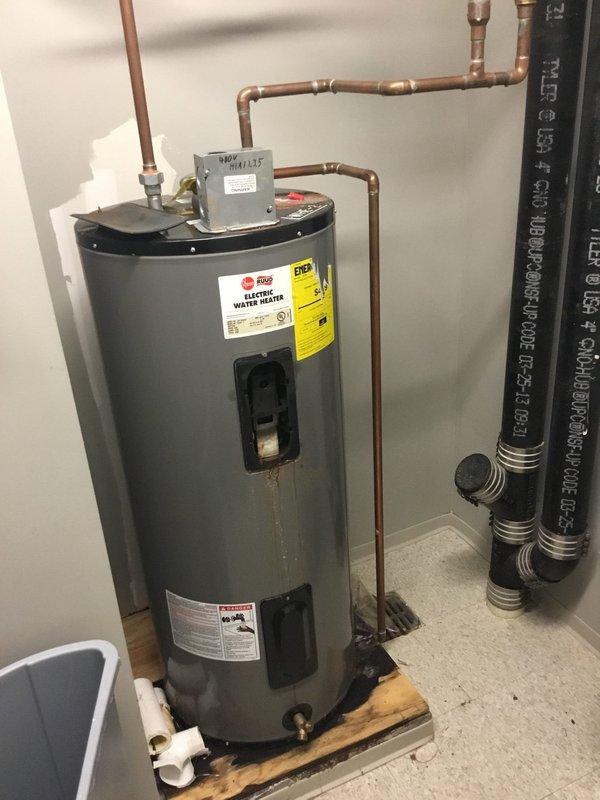 Inspected Rheem water heater that had accumulated water in the drain pan. Performed visual assessment of the unit and surrounding plumbing connections, noting proper installation of P-trap assembly and all associated piping. Verified functionality of water heater components and checked for source of leak.