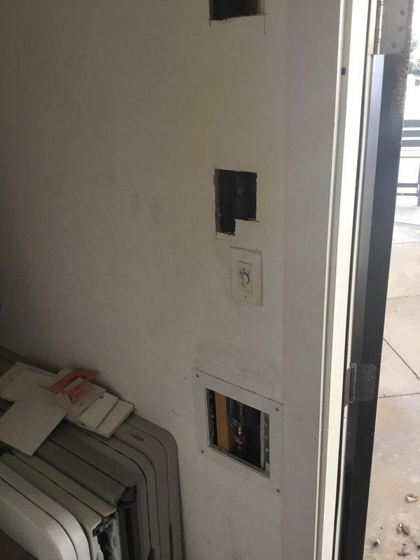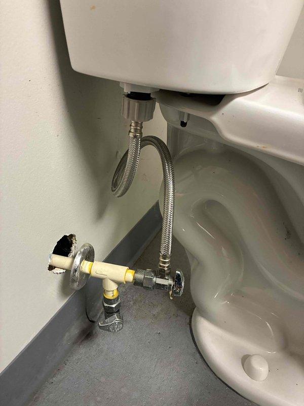 Responded to reported leak in pool house. Upon arrival, conducted thorough inspection of plumbing system and identified water supply issue at toilet connection. Inspected angle stop valve, flexible supply line, and compression fittings beneath toilet tank. Found compromised connection at water supply valve assembly where chrome fitting meets PVC pipe section. Opened wall access panel to examine main plumbing lines and verify extent of water intrusion. Cut exploratory opening in drywall to assess moisture damage and locate source of leak behind wall cavity. Documented copper piping and valve connections visible through access points. Deployed dehumidification equipment to address moisture in affected area and prevent secondary damage. Photographed all findings including plumbing connections, wall openings, and equipment placement for estimate preparation. Recommended replacement of angle stop valve, flexible supply line, and affected PVC sections. Additional scope includes drywall repai