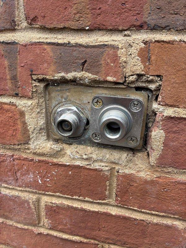 Responded to service call for leaking outdoor hose spigot on exterior brick wall. Upon inspection, identified water leakage at the connection point of the PROFLO M-21L hose bib where the fixture penetrates the wall, with visible corrosion and rust present on the galvanized metal components and copper piping. Repaired the faulty spigot assembly to restore proper function and eliminate the active leak.