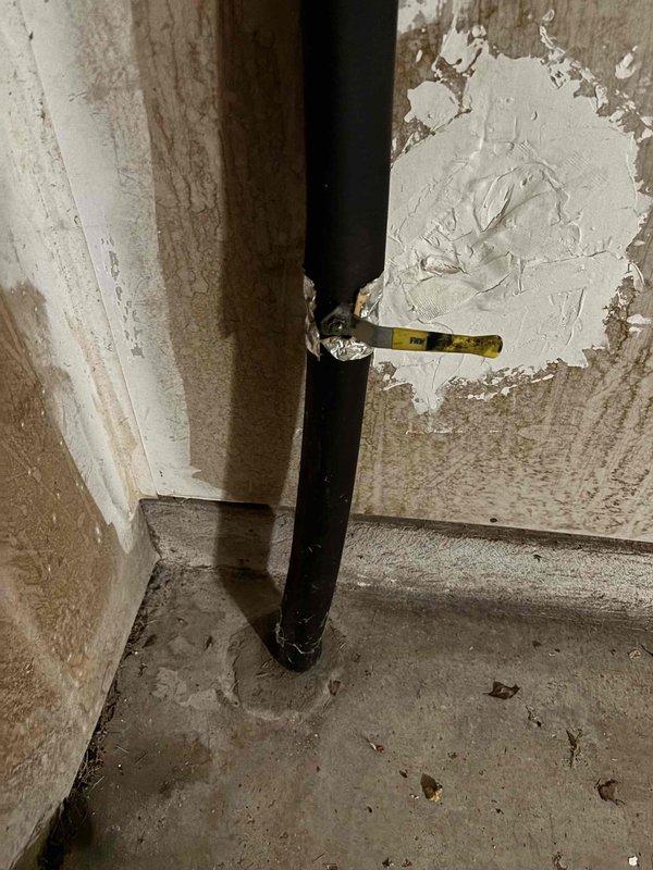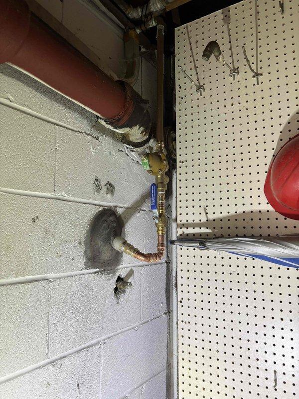 Inspected leaking water main shut off valve. Accessed plumbing system through wall opening, revealing copper pipes with visible corrosion and a brass pressure regulator valve with green tag. Identified shut off valve with red handle as source of leak when operated.