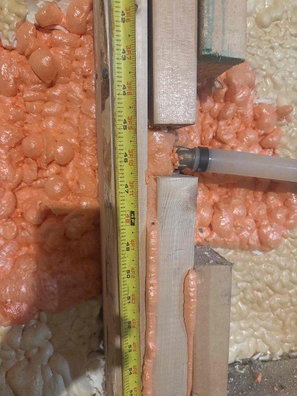 Identified water pooling in yard along driveway. Inspection revealed a water line leak causing saturation and moisture intrusion into basement. Applied spray foam insulation to affected areas after repair to prevent further water infiltration and restore structural integrity.