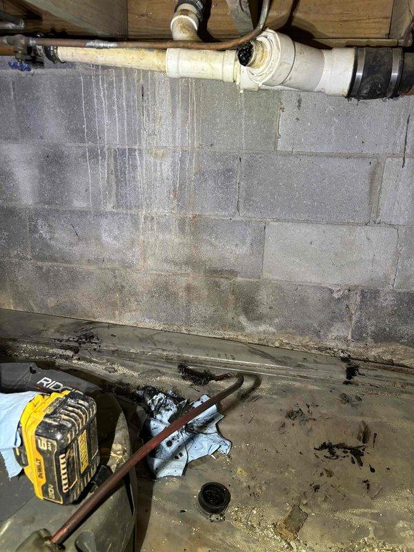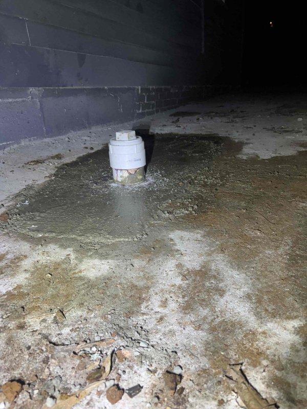 Excavated and installed cleanout in basement/crawlspace area. Hand-dug around pipe to access connection point, then installed PVC cleanout fitting. Completed installation with concrete patch around the new cleanout to restore floor surface.