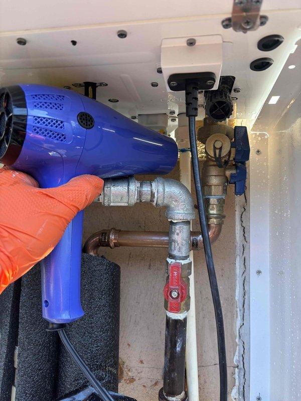 Responded to service call for tankless water heater displaying error code and no hot water output. Customer had previously attempted reset procedure as instructed during prior visit. Diagnosed condensation issue in plumbing enclosure and applied heat treatment to affected components using heat gun. Successfully restored hot water functionality after servicing internal valve system.