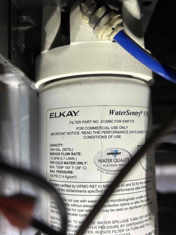 Responded to freezebreak issue near water fountain as reported by customer. Inspected Elkay WaterSentry VII filtration system (part no. 51299C) and identified damaged PVC pipe with leakage. Replaced affected pipe section, verified proper water flow and pressure (within 105 PSI specification), and confirmed full system functionality before completing service.