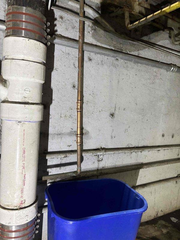 Located and repaired a sewage pipe leak in customer's basement. Inspected the plumbing system including copper supply lines and pressure gauge (reading approximately 80-100 PSI). Sealed compromised section of waste pipe to prevent further leakage and water damage.