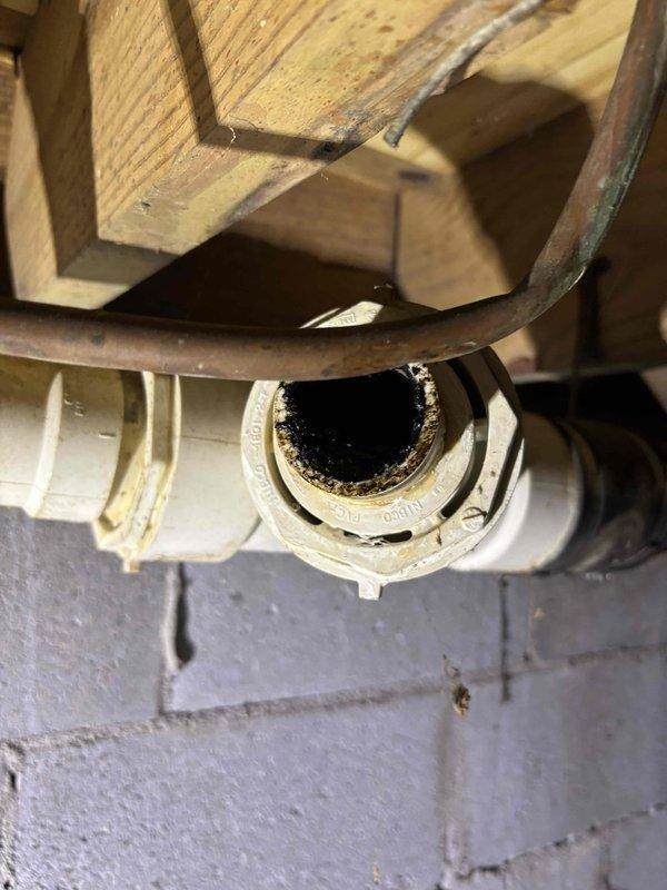 Responded to customer-reported backup issue in basement plumbing system. Discovered significant dark sludge buildup in PVC pipe fitting that was restricting water flow. Cleared clogged drain and removed accumulated debris, restoring proper drainage function. Noted water damage and staining on concrete block walls indicating previous leakage issues that may require future attention.