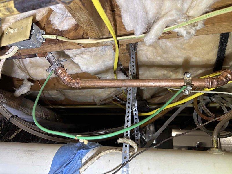 Conducted free estimate for gas line installation to accommodate new gas range, with furnace located in basement. Identified corroded shutoff valve for hose bibb requiring replacement, evidenced by significant green oxidation on brass valve body connected to PVC piping. Also evaluated existing kitchen faucet for replacement service.