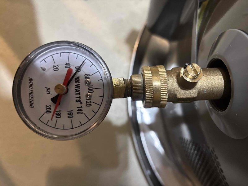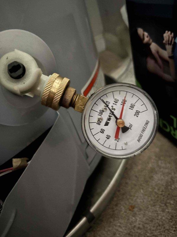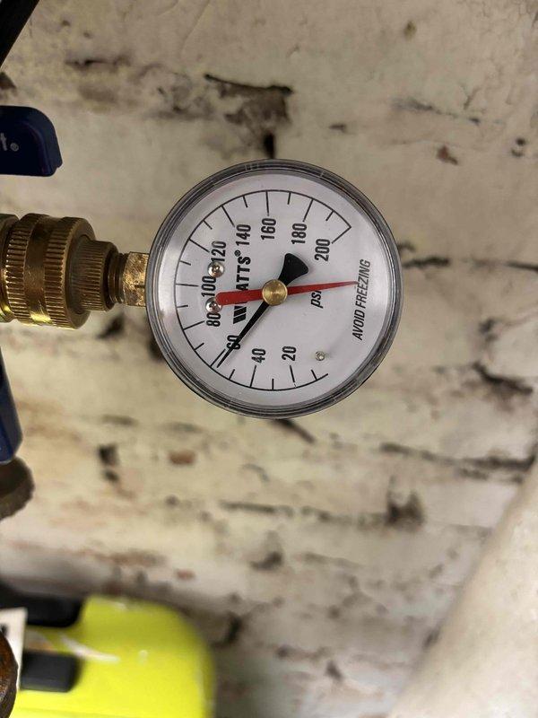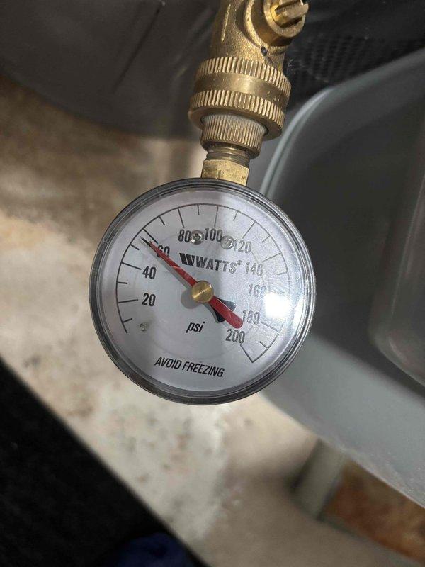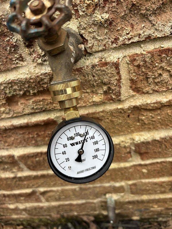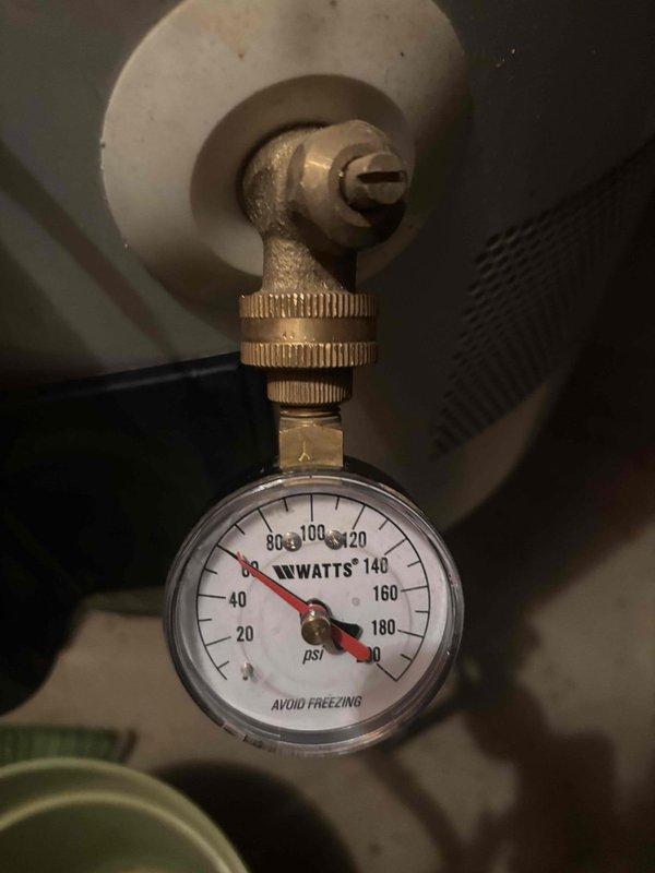 Responded to service call for kitchen sink leak with loose faucet. Upon inspection, found system pressure reading at approximately 20-30 psi on the Watts pressure gauge. Tightened faucet mounting hardware and replaced worn supply line gaskets to resolve the leak issue.