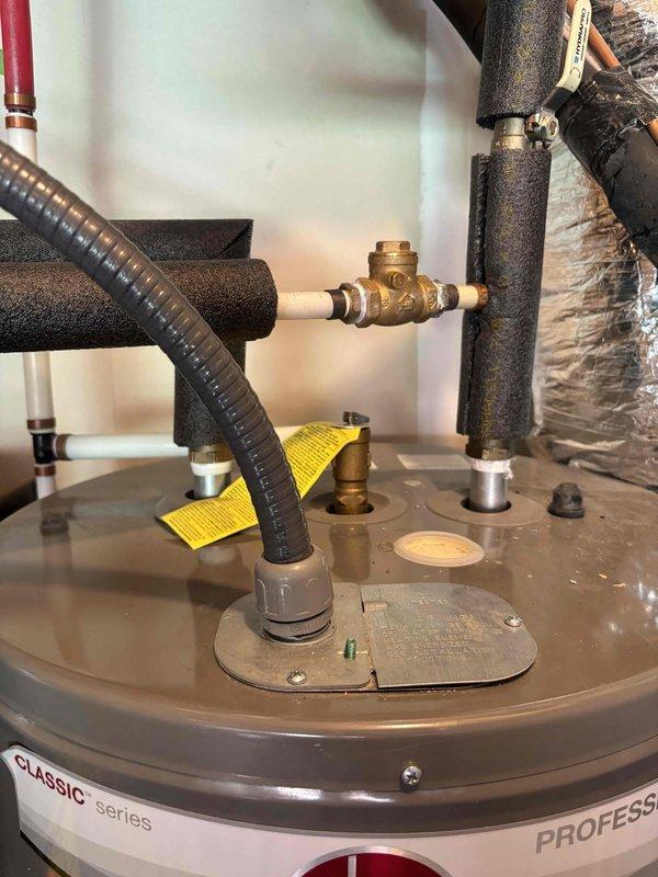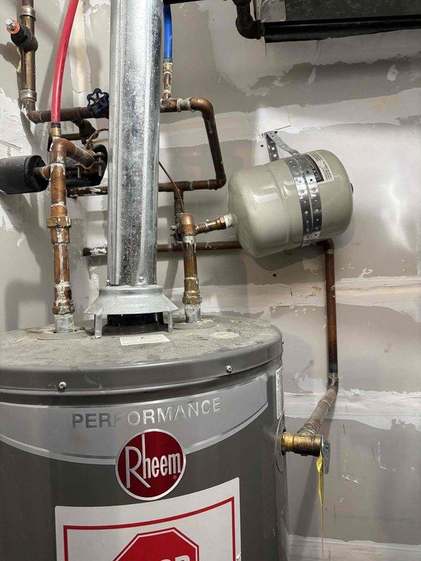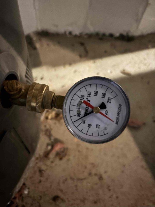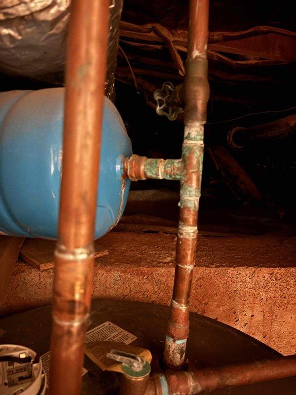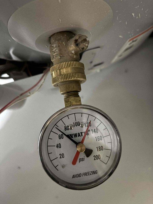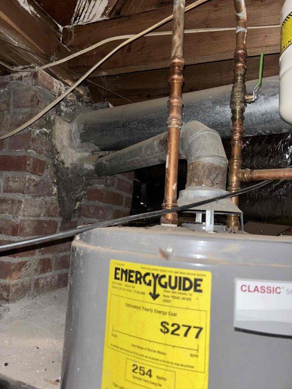 Performed inspection of 10-year-old water heater located in crawlspace behind HVAC unit. System is currently operational but aging. Assessed existing pressure gauge readings and examined copper plumbing connections. Provided customer with replacement options including tankless water heater alternatives.