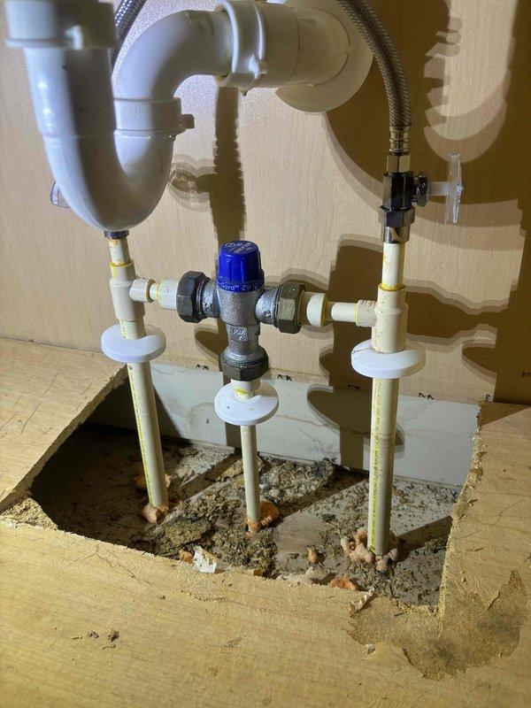 Completed installation of under-sink mixing valve with special order 1/2-inch part as requested. Installed pressure regulator with gauge indicating system pressure at approximately 60 PSI. Connected new valve to existing PVC P-trap drain system and secured water supply lines with proper mounting brackets.