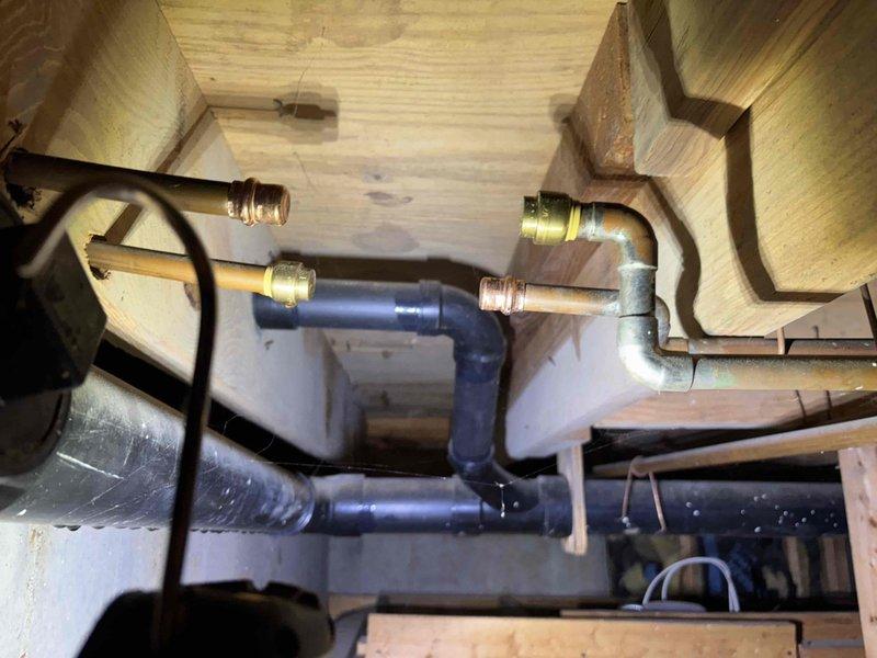 Located and repaired a water leak in the plumbing behind customer's dishwasher. Accessed the affected area through crawl space, replaced damaged copper pipe section and fittings, and verified system integrity with pressure test after repair. Water service successfully restored to property with no further leakage detected.